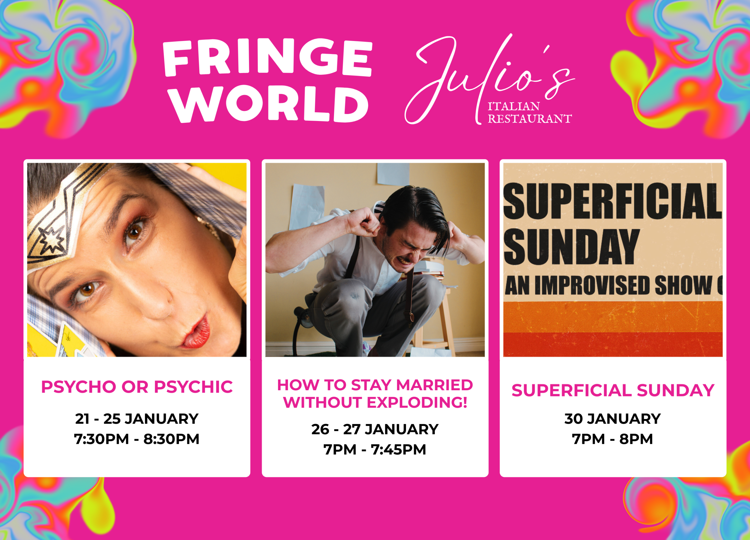Get ready for laughs, Italian flavours, and unforgettable nights at Julio’s! From 21 to 30 January, we’re bringing the Fringe Festival straight to West Perth with an exciting lineup of comedy shows which you can get further details on Fringe World’s website.