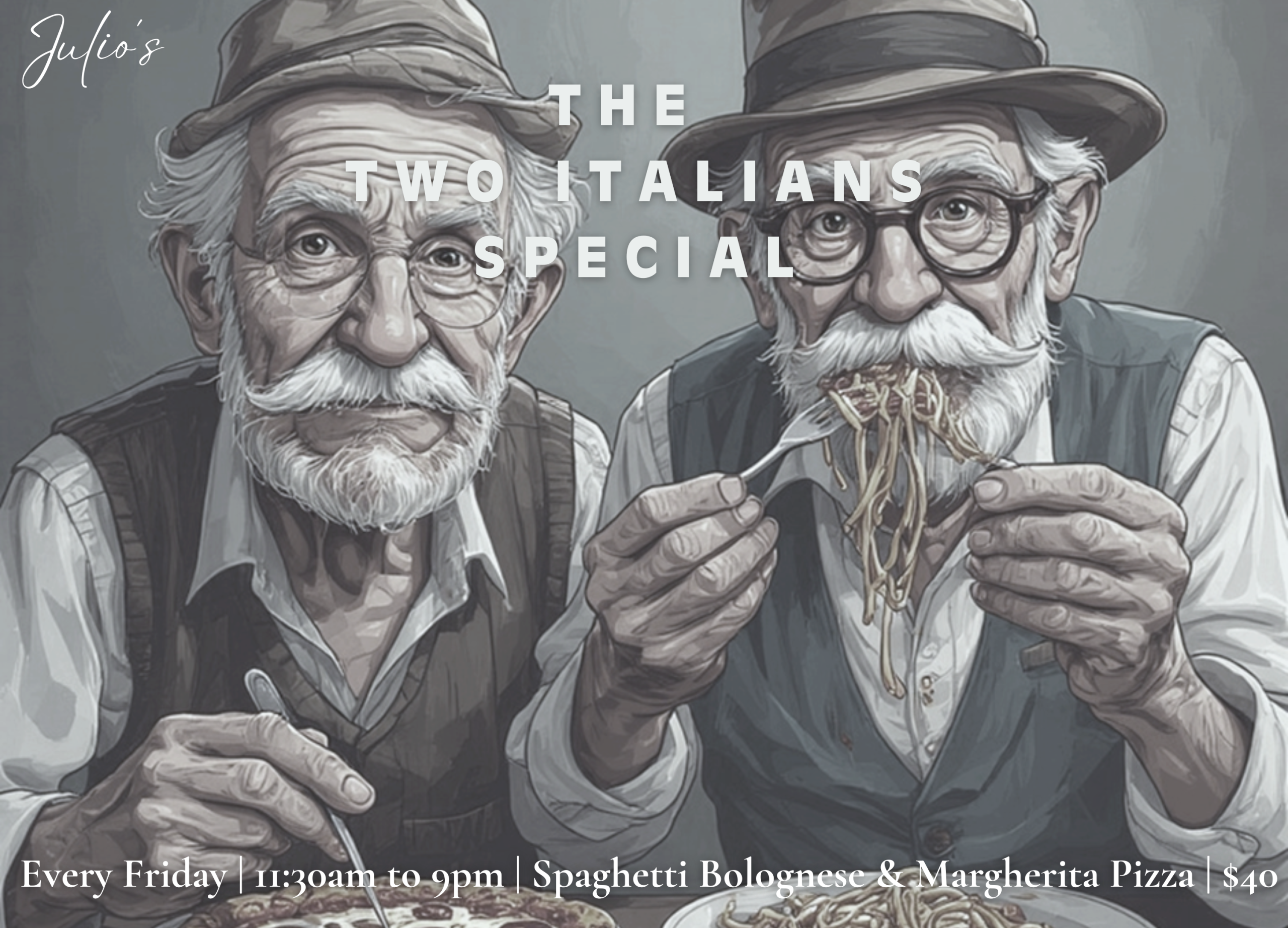 Make Fridays delicious at Julio’s Italian Restaurant in West Perth with our Two Italians Special, available every Friday from 11:30am to 9pm. Enjoy two much-loved Italian classics — spaghetti bolognese simmered low and slow, and a traditional margherita pizza with fresh basil and mozzarella with live music — all for $40. Perfect for sharing, casual catch-ups or an easy Friday meal, this is authentic Italian comfort food done right.